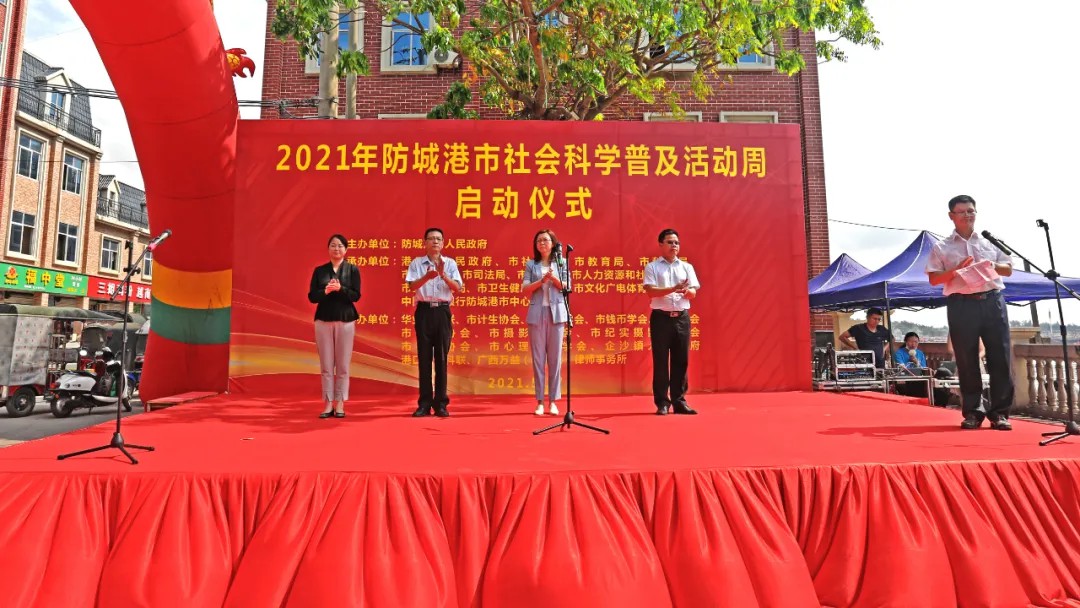 2021517日,防城港市2021社会科学普及周活动启动仪式在港口区企沙镇朝阳路三角塘广场顺利开幕!防城港市人民政府副市长于华等领导出席了启动仪式,并向华侨学校等有关单位、学校、群众代表赠送科普书籍。环球体育app官网下载社会科学界联合会(简称环球体育app官网下载社科联等近20家会员单位踊跃参加了启动仪式及普及周活动。